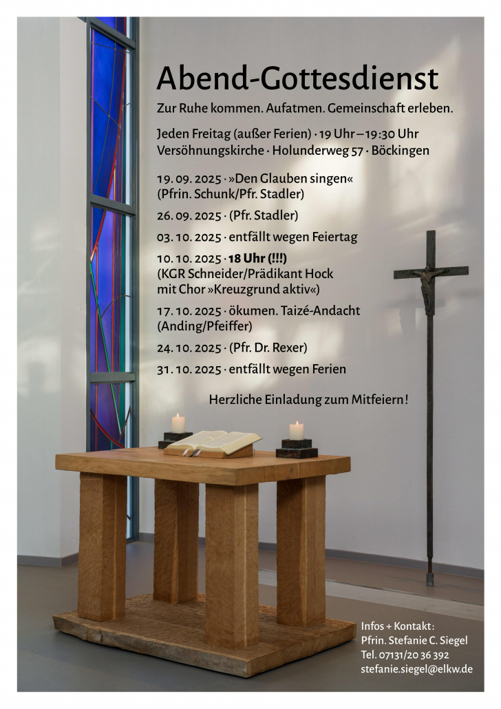 https://kirche-boeckingen-klingenberg.de/wp-content/uploads/2025/04/Plakat-AbendGD-2025-09_10-v002_01-scaled.jpg25601810Wuertzhttps://kirche-boeckingen-klingenberg.de/wp-content/uploads/2023/01/Logo_Kirchengemeinde_Boeckingen_Klingenberg-300x225.pngWuertz2025-04-23 13:33:042025-10-07 12:26:51Abend-Gottesdienst in der Versöhnungskirche